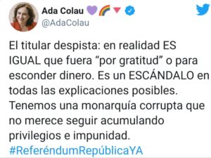 La alcaldesa de Barcelona, Ada Colau, ha acusado este domingo a la monarquía española de «corrupta» y...