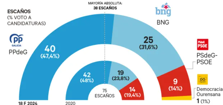 Con casi el 100% escrutado, el bloque de la izquierda se mantiene en un resultado similar al de los últimos años, con 34 escaños sumando a BNG y PSdeG, pero los soberanistas amplían su diferencia con los socialistas, que con nueve diputados obtienen su peor resultado. Del resto de partidos progresistas, tanto Sumar como Podemos, que concurrían por separado, no han conseguido representación. Tampoco lo ha hecho Vox, al que se le sigue resistiendo este parlamento, y sí que ha entrado por primera vez Democracia Ourensana, con un diputado.