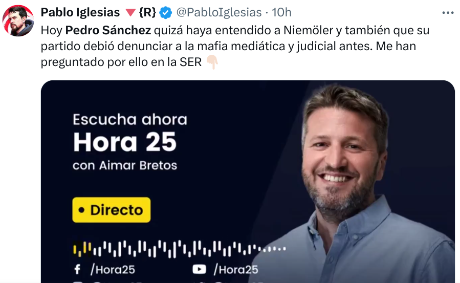 Hoy Pedro Sánchez quizá haya entendido a Niemöler y también que su partido debió denunciar a la mafia mediática y judicial antes. Me han preguntado por ello en la SER pic.twitter.com/oPto1TwLai