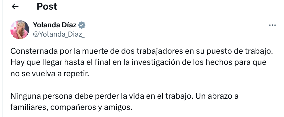 Díaz, en declaraciones a La Sexta recogidas por Europa Press, ha mostrado sus condolencias a las familias de los dos trabajadores fallecidos y ha señalado que la Inspección investigará las circunstancias de este accidente laboral mortal.